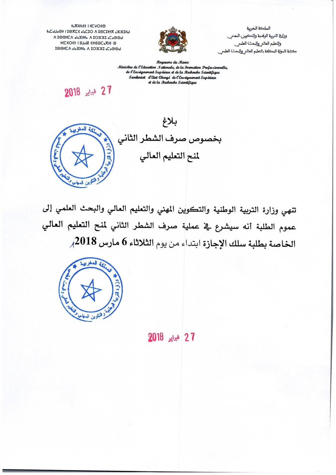 أصدرت و زارة التربية الوطنية و التكوين المهني و البحث العلمي اليوم بتاريخ 27/02/2018 بلاغا رسميا أشارت فيه إلى أنه سيتم  الشروع في صرف الشطر الثاني من المنحة الخاصة بطلبة الاجازة و ذلك ابتداء من يومه الثلاثاء 6 مارس 2018.