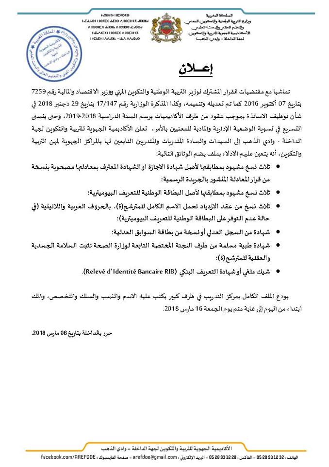 يودع الملف الكامل بمركز التدريب في ظرف كبير يكتب عليه الاسم والنسب والسلك والتخصص، وذلك ابتداء من اليوم إلى غاية متم يوم الجمعة 16 مارس 2018.