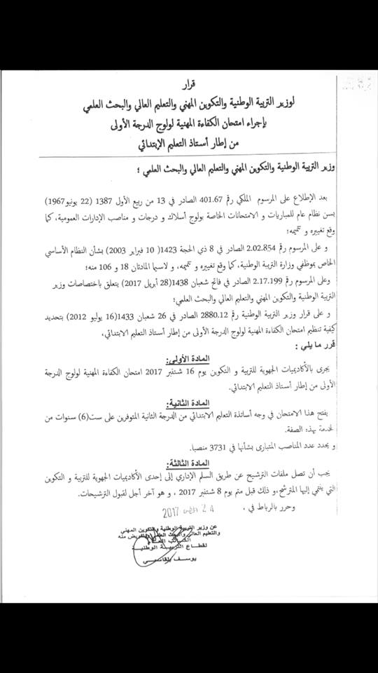 فإن عدد المناصب المخصص لولوج الدرجة الاولى بالنسبة لدورة شتنبر 2017 هو 3731 منصب مالي.