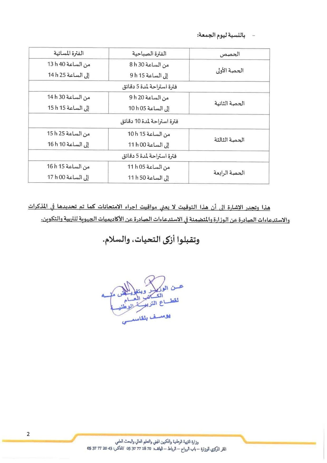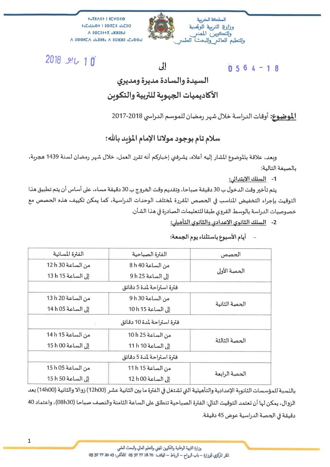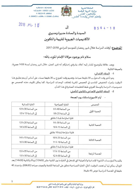 Home » أوقات الدراسة خلال شهر رمضان – مراسلة وزارية 10 ماي 2018أوقات الدراسة خلال شهر رمضان – مراسلة وزارية 10 ماي 2018by Mohamed khan Advertisements previousاستعد للامتحان المهني : كيفية تحليل نص تربويnextالاستعداد للامتحان المهني منهجية تدريس الرياضيات بالابتدائي ملخصة و شاملة