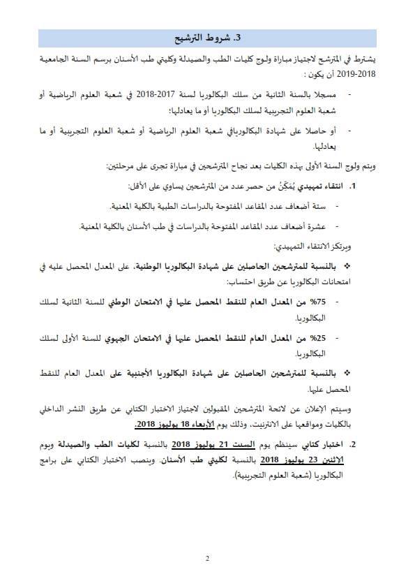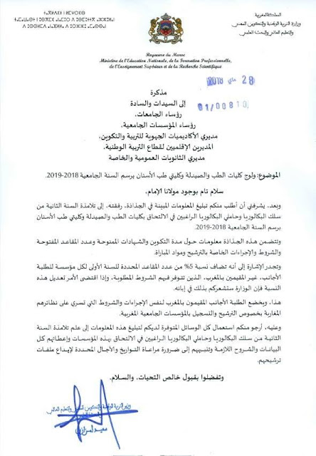 ولوج كليات الطب و الصيدلة و كليتي طب الأسنان برسم السنة الجامعية 2018-2019مراسلة وزارة التربية الوطنية و التكوين المهني و التعليم العالي و البحث العلمي قطاع التعليم العالي و البحث العلمي