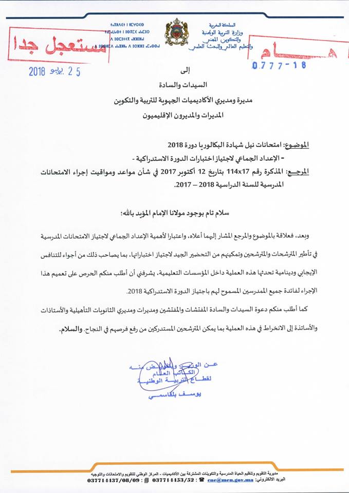 Home » مراسلة وزارية مستعجلة : الإعداد الجماعي للدورة الإستدراكية لنيل شهادة البكالوريا دورة 2018مراسلة وزارية مستعجلة : الإعداد الجماعي للدورة الإستدراكية لنيل شهادة البكالوريا دورة 2018by Mohamed khan Advertisements previousأستعد للامتحان المهني : الخطوات المنهجية لتدريس النشاط العلميnextنتائج الحوار القطاعي للتعليم 29 يونيو 2018