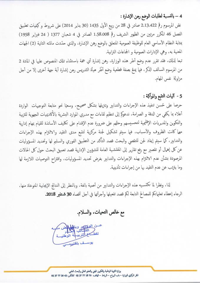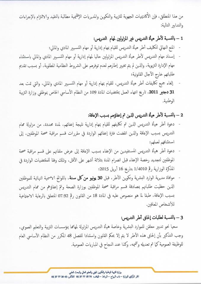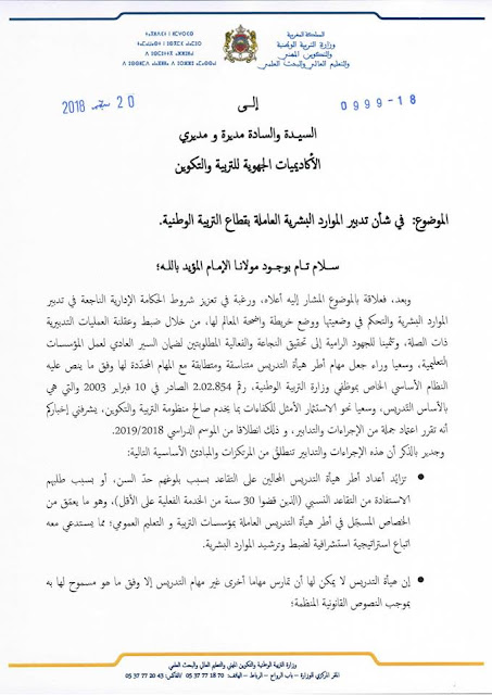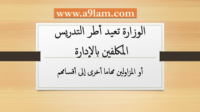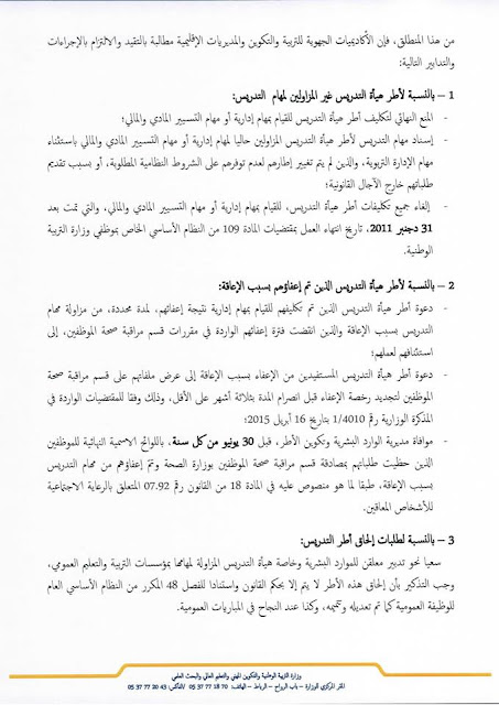 Home » الوزارة تعيد أطر التدريس المكلفين بالإدارة إلى أقسامهمالوزارة تعيد أطر التدريس المكلفين بالإدارة إلى أقسامهمby Mohamed khan قررت وزارة التربية الوطنية إعادة أطر هيئة التدريس المزاولين لمهام أخرى إلى أقسامهم وعزت الوزارة السبب إلى الخصاص الموجود في هذه الفئة وخصوصا مع موجات التقاعد التي يعرفها قطاع التربية الوطنية. فيما يلي أسفله المذكرة الوزارية. Advertisements previousالتوزيع السنوي فرنسية للمستوى الثاني (Répartition annuelle Mes apprentissages 2APG (2018nextالتوازیع السنویة فرنسیة المستوى الخامس ابتدائي حسب المراجع :Répartition annuelle: mes apprentissage et pour communiquer
