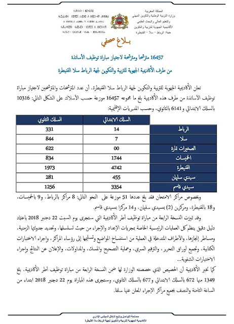 Home » الأكاديمية الجهوية للتربية والتكوين لجهة الرباط سلا القنيطرة- عدد المترشحين لمبارة التوظيف 16457الأكاديمية الجهوية للتربية والتكوين لجهة الرباط سلا القنيطرة- عدد المترشحين لمبارة التوظيف 16457by Mohamed khan أعلنت الأكاديمية الجهوية للتربية والتكوين لجهةة الرباط سلا القنيطرة عن أعداد المترشحين لاجتياز مباراة التوظيف الخاصة بالأساتذة دورة دجنبر 2018. * السلك الابتدائي 10316 * السلك الثانوي 6141 فيما يلي إعلان الأكاديمية Advertisements previousالجدولة الزمنية لمباراة توظيف الأساتذة من طرف الأكاديمياتnextأعداد المترشحين لاجتياز مباراة التوظيف الخاصة بالأساتذة دورة دجنبر-2018 جميع الجهات متجدد