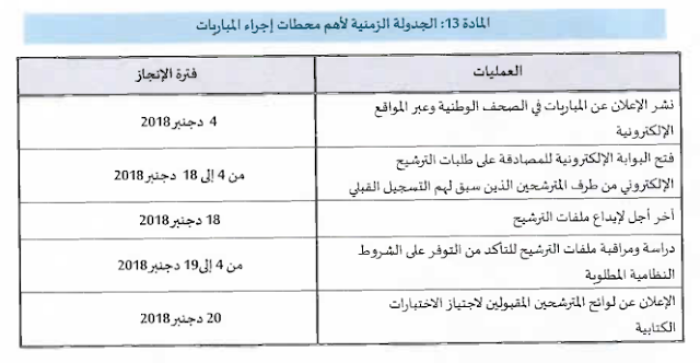 حسب المذكرة المنظمة لمباراة التعاقد فإن موعد الاعلان عن لوائح الناجحين في الاختبارات الكتابية وبرنامج الاختبارات الشفوية سيكون ابتداء من يوم 03 يناير 2019 وسيتم اجراء الاختبارات الشفوية والعملية ابتداء من 5 يناير الى غاية 9 منه ة ذلك لمدة 5 أيام .