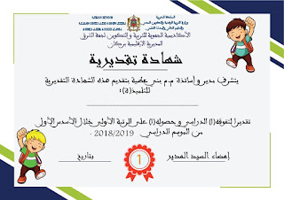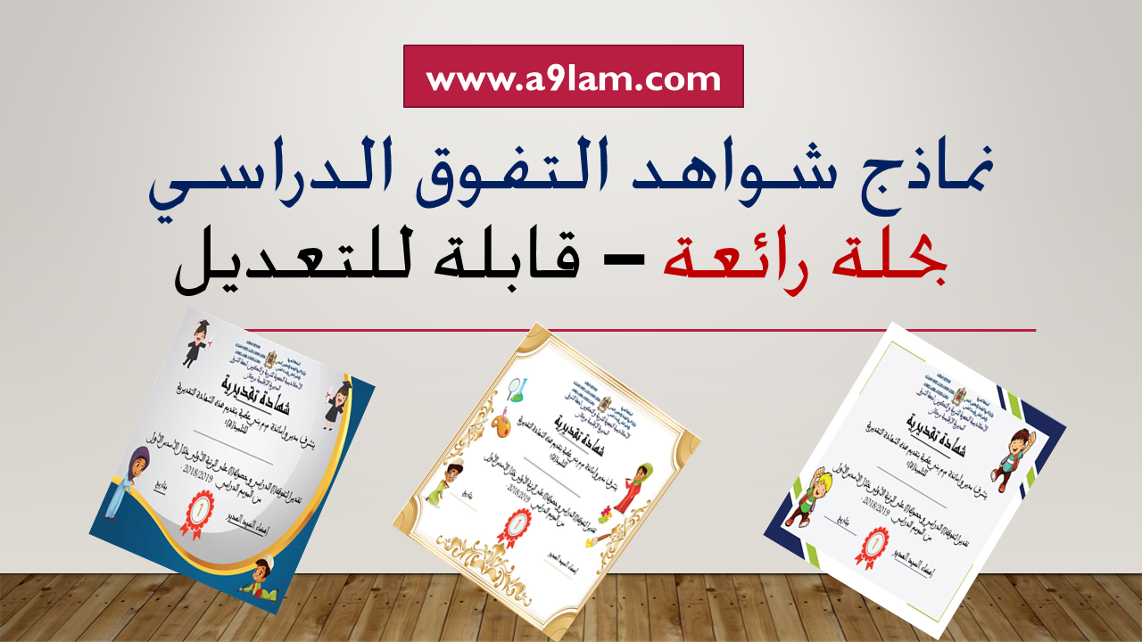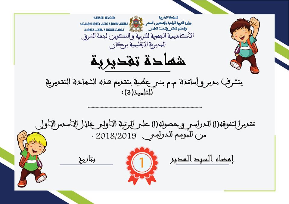 الشواهد من إعداد الأستاذ عزيز عبدالرحيم مشكورا. وهذه النماذج هي قابلة للتعديل عليها حسب اسم المتعلم والمديرية والمعلومات الأخرى إذ يمكن الاستفادة منها من أجل تشجيع التلاميذ المتفوقين.
