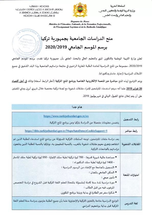 فيما يلي المذكرة الوزارية الخاصة ب : منح الدراسات الجامعية بتركيا برسم الموسم الجامعي2019/2020