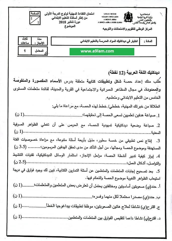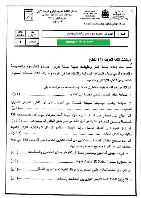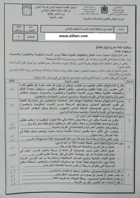 تصحيح ديداكتيك اللغة العربية للدرجة الأولى للتعليم الابتدائي دورة 2018 (الامتحان المهني )