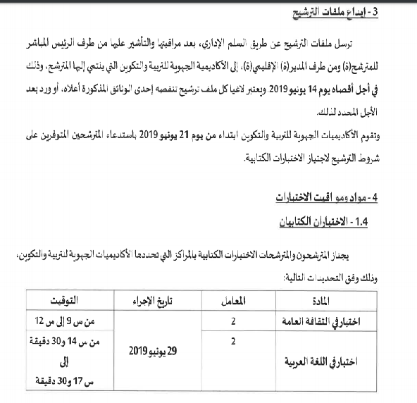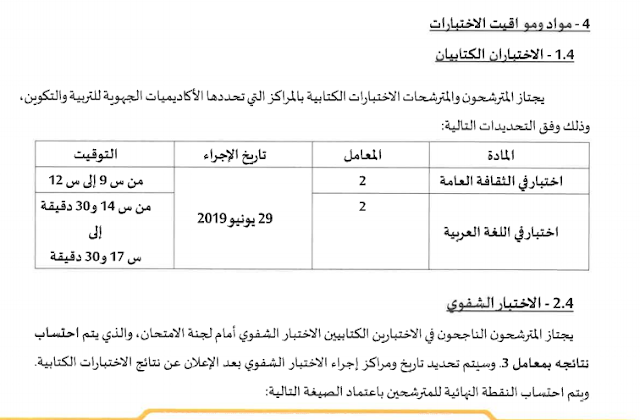 مواد و مواقيت الاختبارات الكتابية بمراكز التي تحددها الاكاديمات الجهوية:
