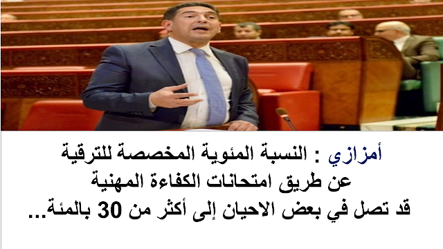 و اكدت الوزارة أن النسبة المئوية المخصصة للترقية عن طريق إمتحانات الكفاءة المهنية محددة في 13 بالمئة من عدد المستوفين لشروط الترشيح إلى غاية 31 دجنبر من سنة تنظيم الامتحان إلا أن نسبة النجاح في أغلب الأحيان تفوق الحصيص المخصص و قد تصل إلى أكثر من 30 بالمئة من مجموع الحاضرين للإمتحانات