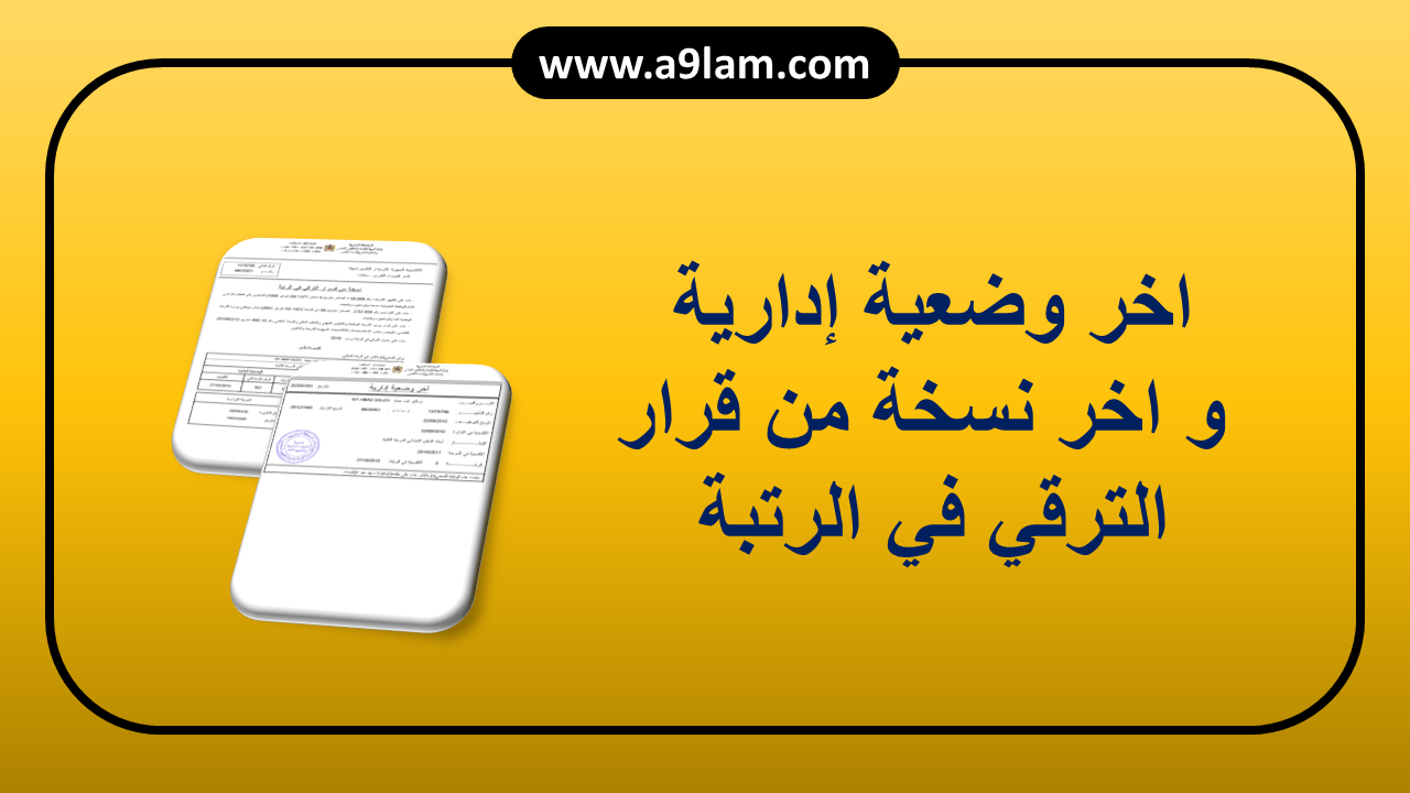 السلام عليكم ورحمة الله وبركاته نقدم لحضراتكم طريقة الحصول واستخراج اخر وضعية إدارية و اخر نسخة من قرار الترقي في الرتبة إضافة إلى الاطلاع على على الوضعية الادارية كل هذا من خلال خوقع تبليغ.